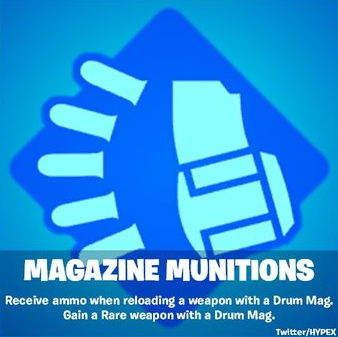 ![]() | Magazine Munitions | Receive ammo when reloading a weapon with a Drum Mag. Gain a Rare weapon with a Drum Mag. |