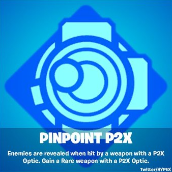 ![]() | Pinpoint P2X | Enemies are revealed when hit by a weapon with a P2X Optic. Gain a Rare weapon with a P2X Optic. |