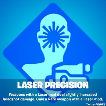 ![]() | Laser Precision | Weapons with a Laser mod deal slightly increased headshot damage. Gain a Rare weapon with a Laser mod. |
