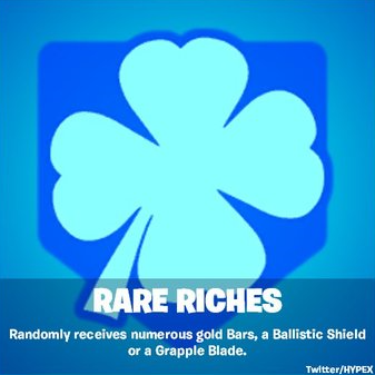 ![]() | Rare Riches | Randomly receives numerous gold Bars, a Ballistic Shield, or a Grapple Blade. |