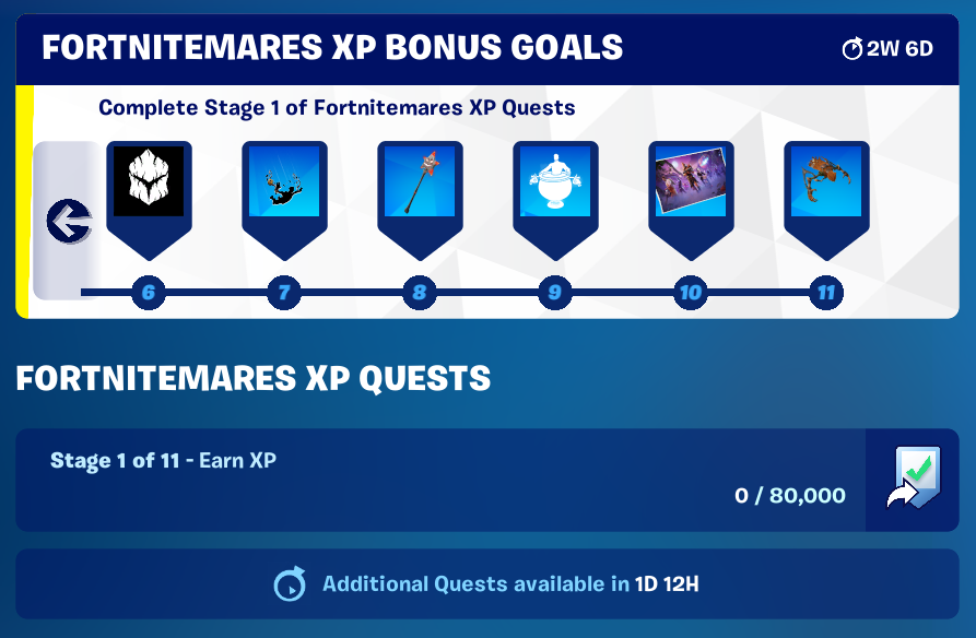 To unlock them, your only goal is to acquire XP during the event. For example, to secure the first cosmetic, The Fangler Bass, you must earn 80,000 XP. Each time you reach the 80,000 XP mark, you will advance to the next stage. However, based on players’ reports, you can only unlock the first two free rewards until the next Fortnitemares quests become available.