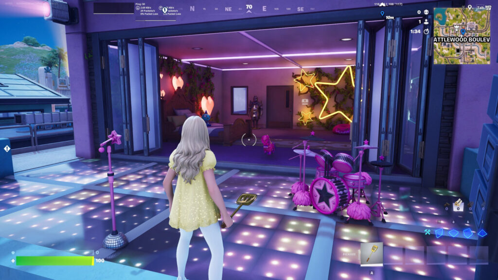 If you are searching for the Chappell Roan ‘Pink Pony Club’ reference in Fortnite, you can head to the Battlewood Boulevard point of interest (POI). You can see the building marked on the mini-map above, which contains various pink instruments and a small pink pony.