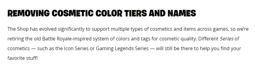 “The Shop has evolved significantly to support multiple types of cosmetics and items across games, so we’re retiring the old Battle Royale-inspired system of colors and tags for cosmetic quality. Different Series of cosmetics — such as the Icon Series or Gaming Legends Series — will still be there to help you find your favorite stuff!”