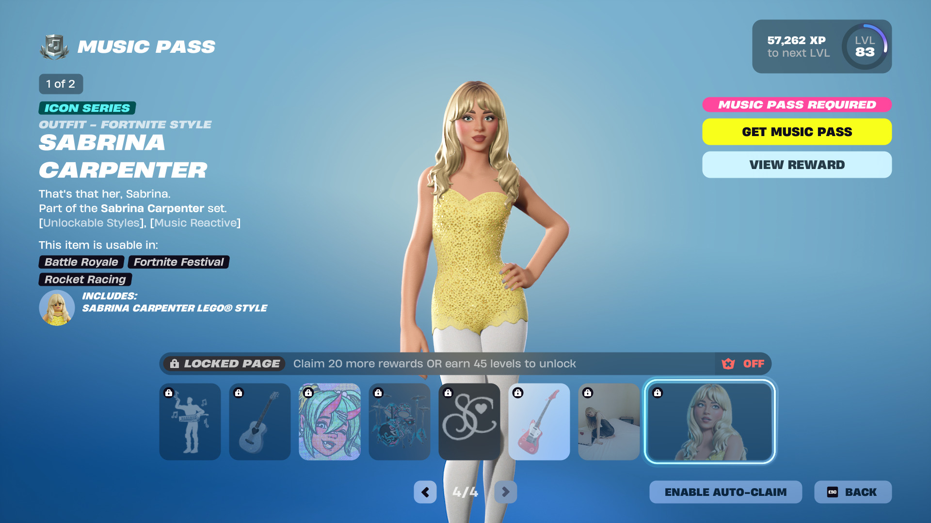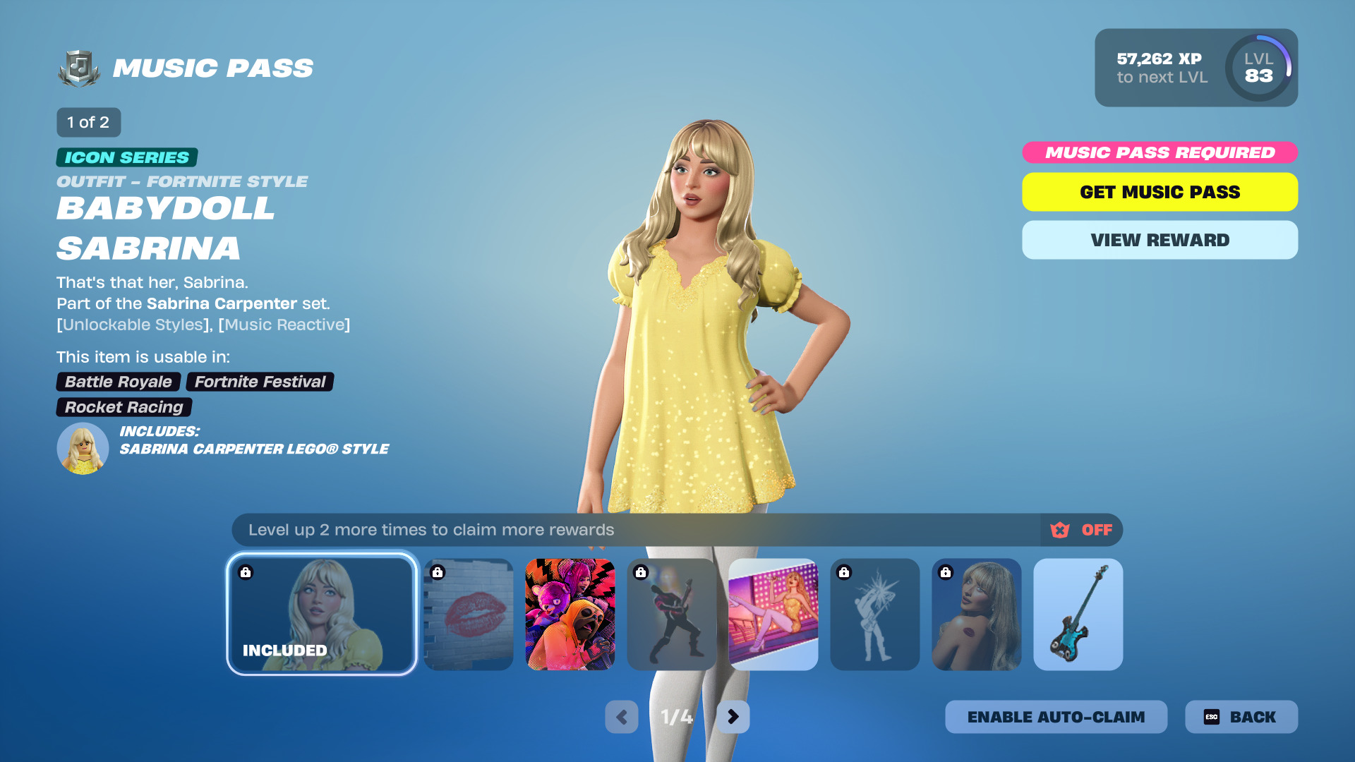 First is the Music Pass, which features the base Sabrina Carpenter Fortnite skin. To unlock this, you must purchase the Premium version for 1,400 V-Bucks. That will automatically earn you the Babydoll Sabrina skin without any additional steps. You can unlock the other style by progressing through the Pass.