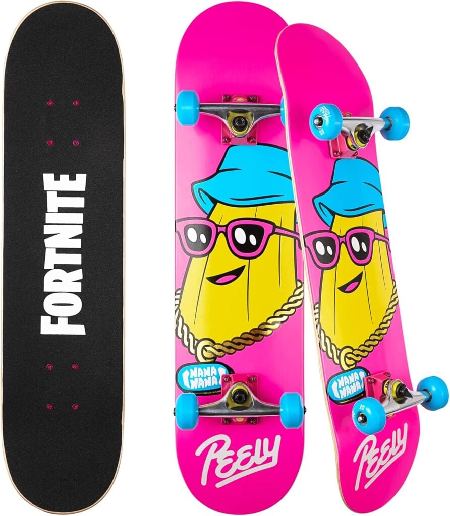 Do you or your favorite Forntite gamer love to skate? This Fortnite skateboard is essential to buy then this Black Friday. This popular seller features a vertical Fortnite logo on the top side with Peely on the bottom wearing a gold chain and bucket hat.