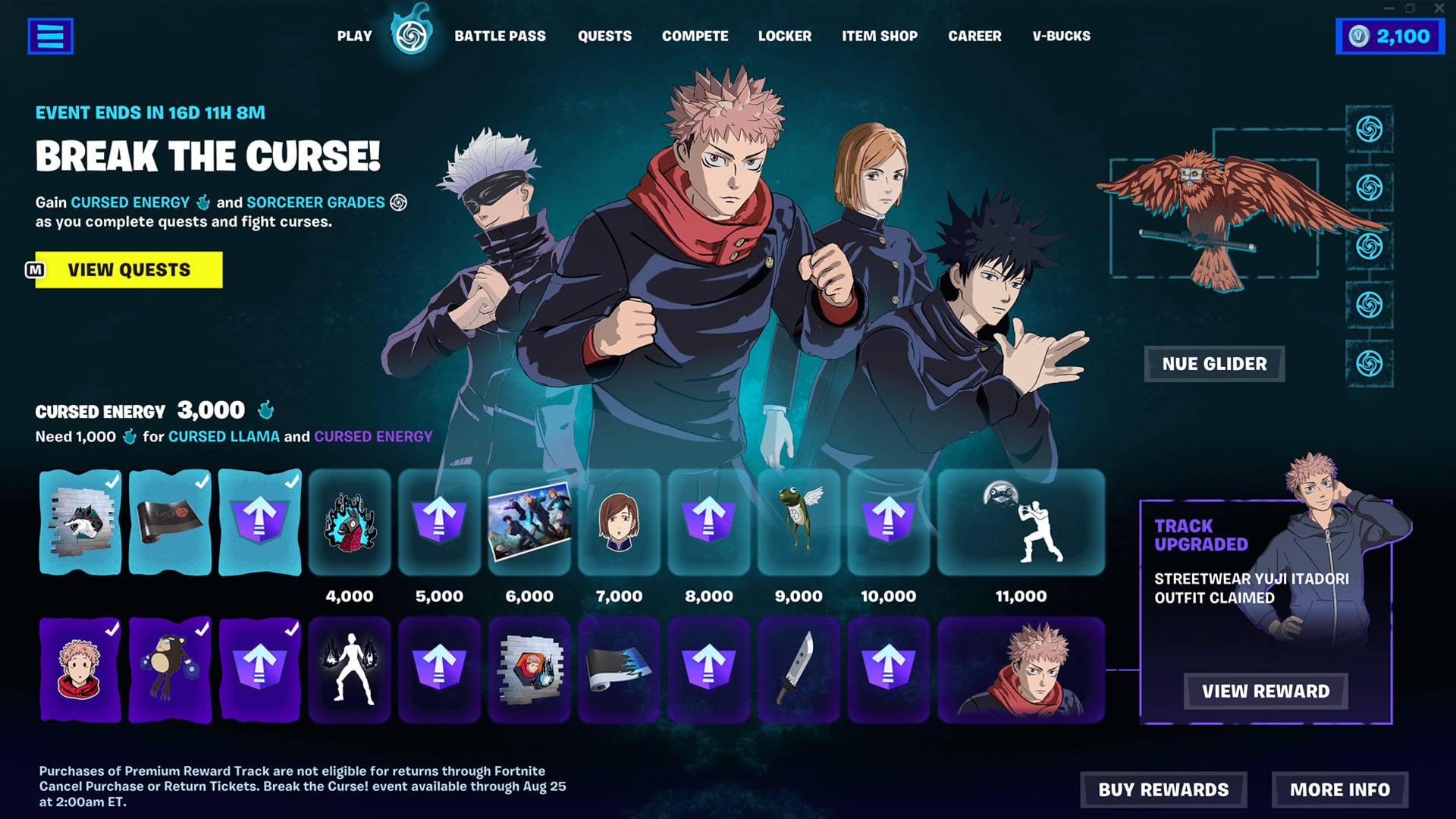 The Break the Curse! quests can be thought of as a mini Battle Pass with both premium and free reward tracks. Completing objectives awarded players with JJK-themed cosmetics such as sprays, emoticons, and more.