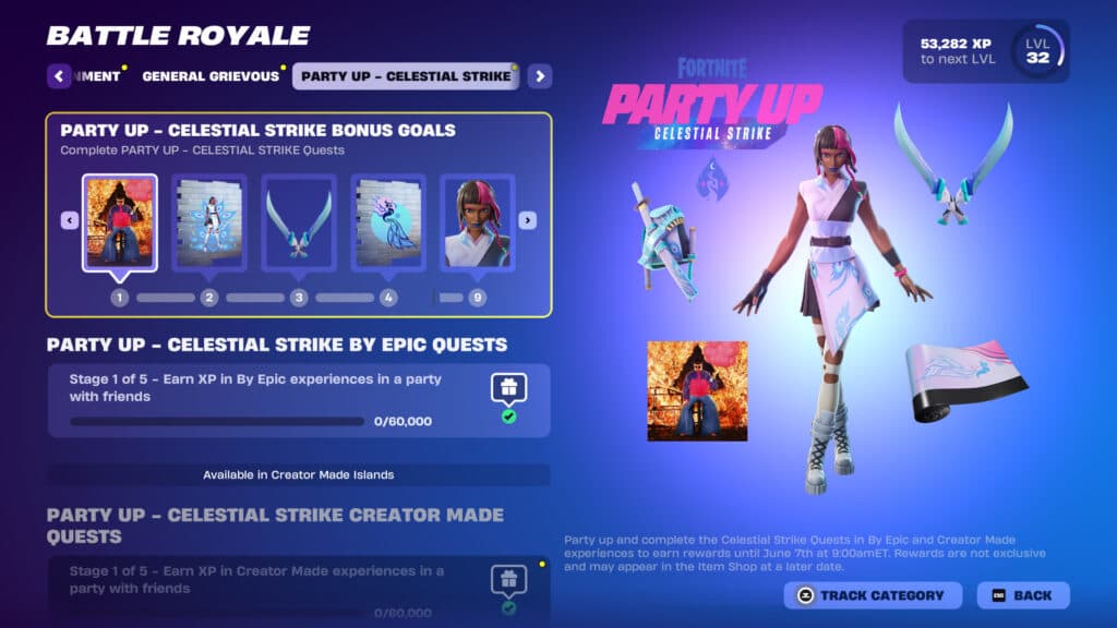 Anyone interested in acquiring the skin has until June 7 at 9 a.m. ET to complete the questline. You must play Epic experiences and Creator Made experiences with friends. To unlock each item outlined above requires 60,000 XP acquired through Battle Royale, LEGO, Fortnite Festival, and Creative modes.