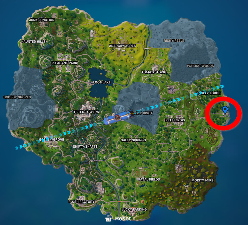 The legendary moment in Fortnite history went down at the location marked above. You can find this spot slightly southeast of Lonely Lodge, behind the house indicated on the map. Once you head to this spot, you will find some seemingly random ramps built along the backside of the mountain.