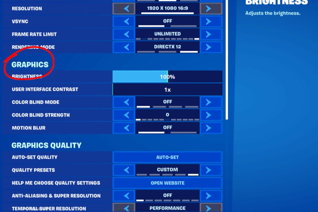 It is vital that you have the graphics set properly in your Fortnite settings. First off, always make sure your brightness is set to 100%. There is absolutely no reason to have this any lower or any higher.