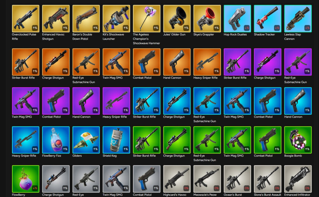 The list of removed items and weapons is noticeably longer than the items added to Reload. Of all the vaulted items, the most significant are the various Chapter 2 Mythic weapons. Those include Meowscle’s Peow Peow Rifle, Ocean’s Burst Assault Rifle, Slone’s Burst Assault Rifle, and more.