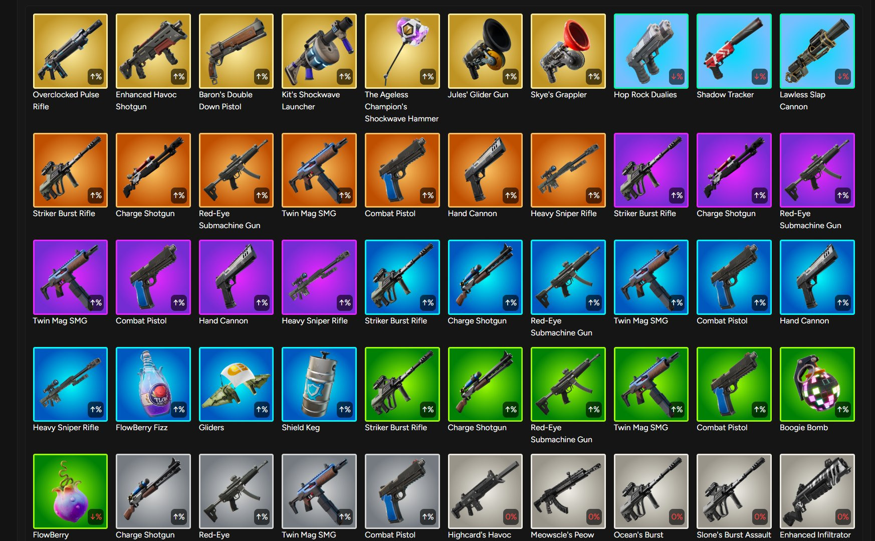 The list of removed items and weapons is noticeably longer than the items added to Reload. Of all the vaulted items, the most significant are the various Chapter 2 Mythic weapons. Those include Meowscle’s Peow Peow Rifle, Ocean’s Burst Assault Rifle, Slone’s Burst Assault Rifle, and more.