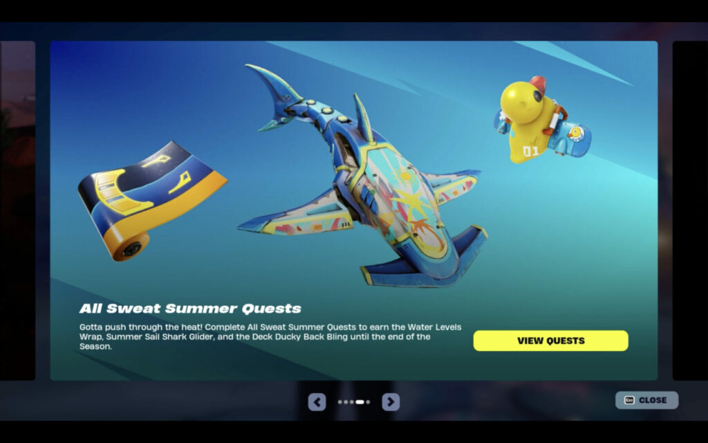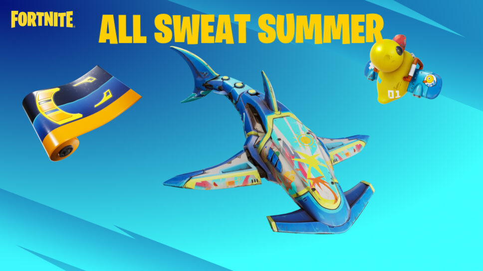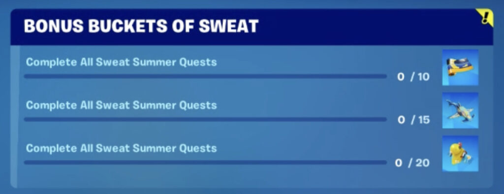 The Fortnite Summer 2024 “All Sweat Summer” Quests are now live. You can unlock all three rewards shown above by completing 20 challenges. The rewards include a Wrap, Glider, and Back Bling. Although only three Quests are currently available, more will progressively unlock through the All Sweat Summer event.