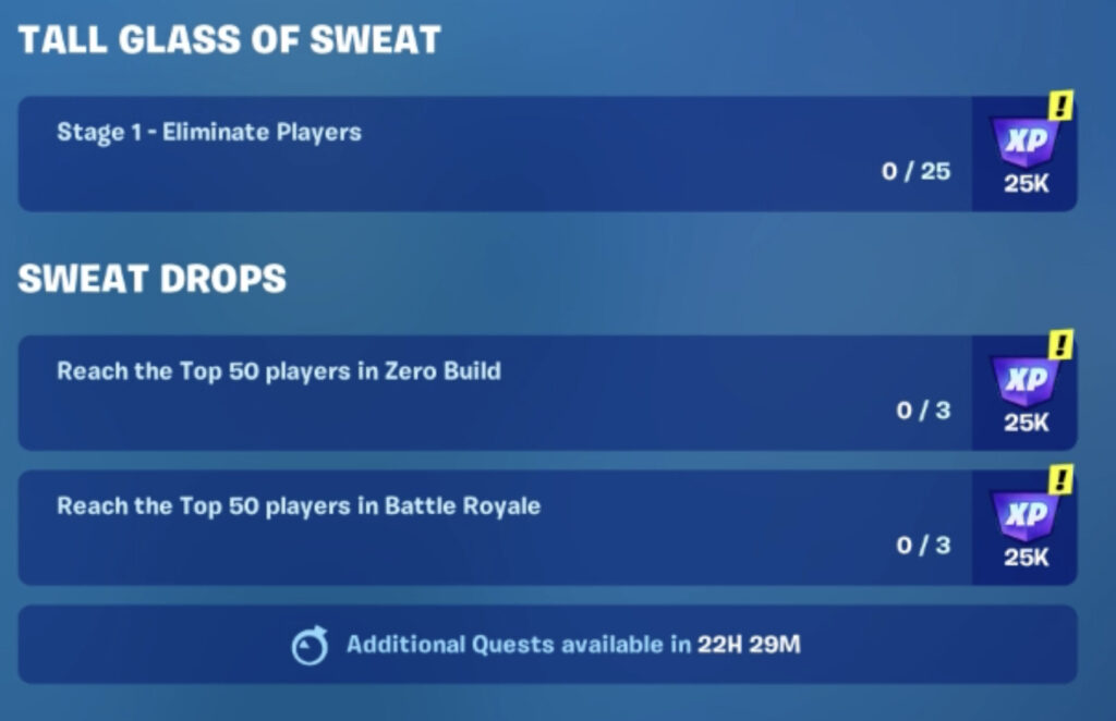 - Reach the Top 50 players in Zero Build (0/3) – 25,000 XP