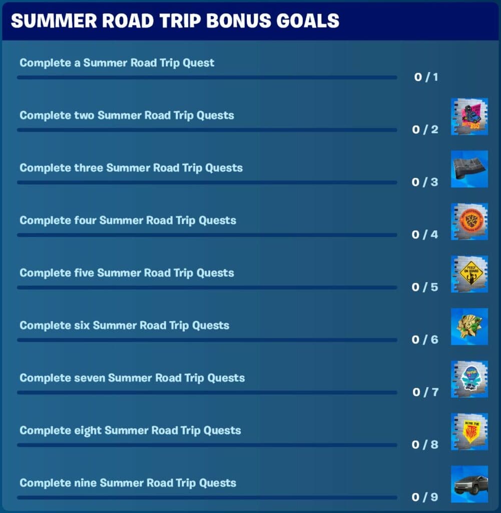 Beyond the Cybertruck-related items, you can earn additional rewards through the Summer Road Trip Questline. Those include a Wrap, Back Bling, and several Sprays.