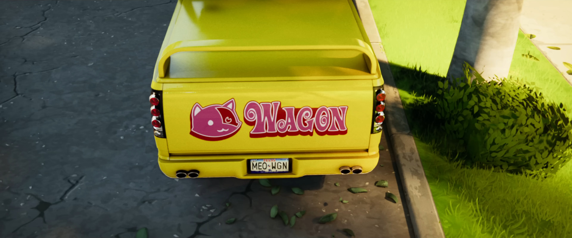 It does not feature the words as seen in Vol. 1, instead replacing the first word with Meowscles’ face. Additionally, the license plate indicates it could be called the Meowagon or something similar.
