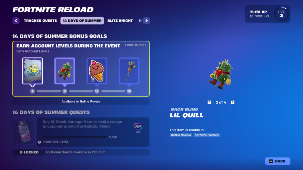 After earning 16 account levels, you will receive the Lil Quill Back Bling, which is the final of the four. Time is ticking, so you’d better act fast before July 7 comes and goes.