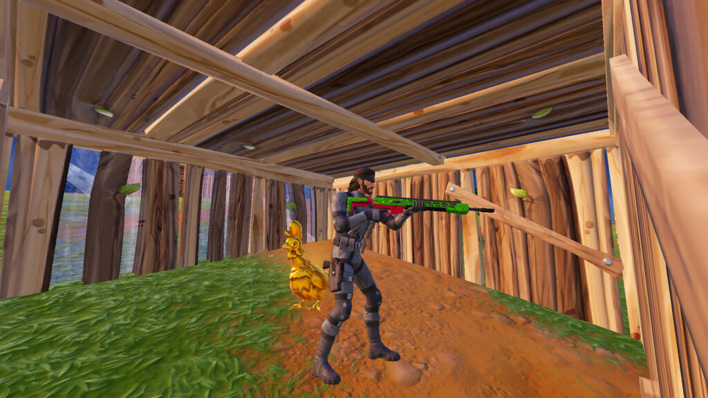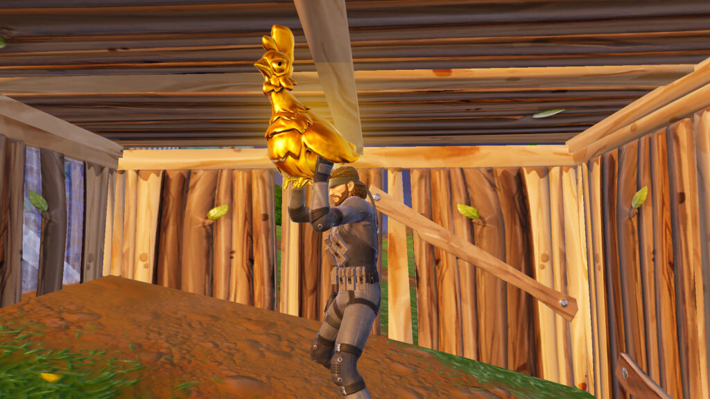 After landing at Fencing Fields, we hopped in a car and checked the area until we finally saw a shiny bird. We approached the Golden Chicken in the Fortnite match and built a box around it. You can find one in various other locations, but Frenzy Farm was generous.