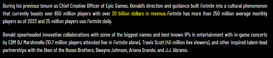Fortnite’s revenue has always been somewhat of a mystery, considering it’s a free game but features paid cosmetics. Donald Mustard’s bio revealed that Fortnite has generated $20 billion—a genuinely astronomical figure.