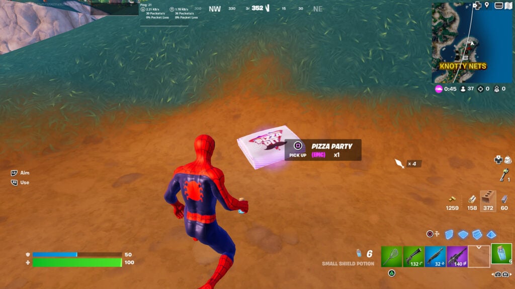 It took us quite some time to find the Pizza Party item following the patch v26.10 update. However, we found one in a normal Chest at the Knotty Nets location. The item spawns on the ground and in Chests, so perhaps the spawn rate is slightly lower than other items.