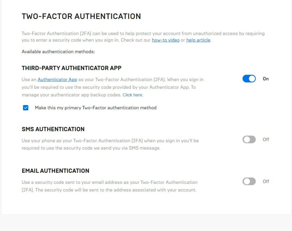 You can use three options for Fortnite 2FA; Third-Party Authenticator App, SMS Authentication, and Email Authentication.