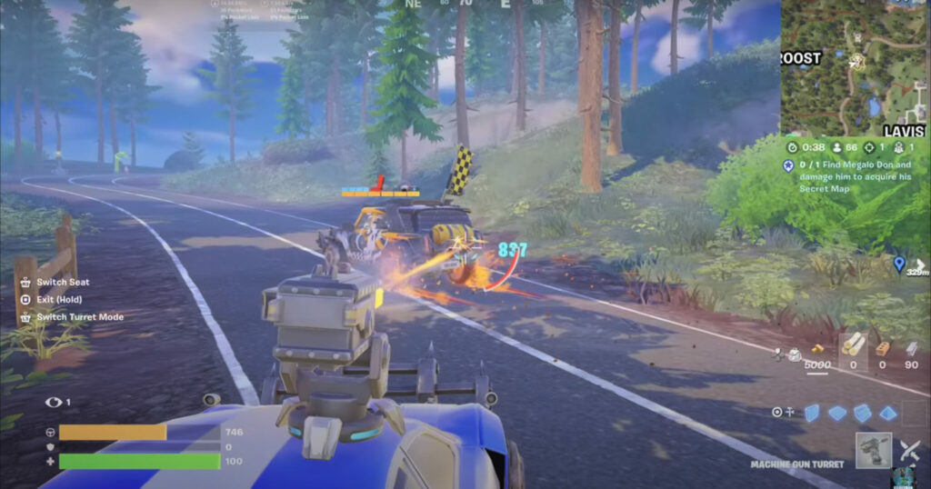 Luckily, all you have to do is put a few shots on the character to get his Secret Map. If you find him on the road, though, he will be accompanied by other NPCs, including a giant armored Battle Bus.