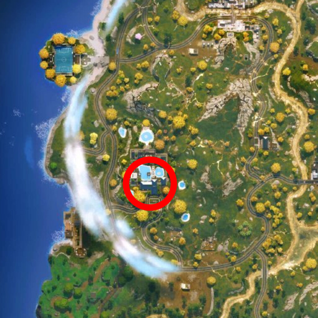 You can find the secret Vault in the Outlaw Oasis point of interest (POI). After dropping at this location, head to the house marked on the above map. It’s on the southern section of Outlaw Oasis, featuring a large carpet on the ground and three wolf statues.