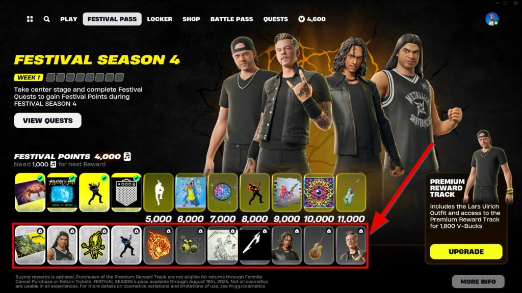 To unlock all four Metallica Fortnite skins and other rewards, purchase the Premium Track and complete Quests to earn Festival Points. Upon purchasing the Premium Track, you will instantly unlock the Lars Ulrich Outfit.