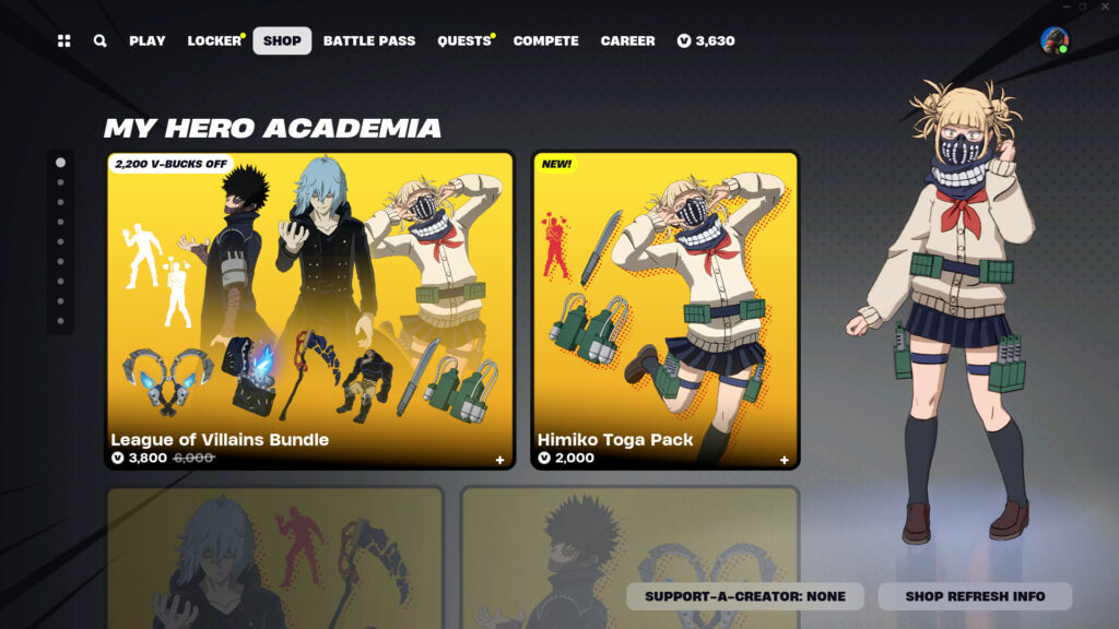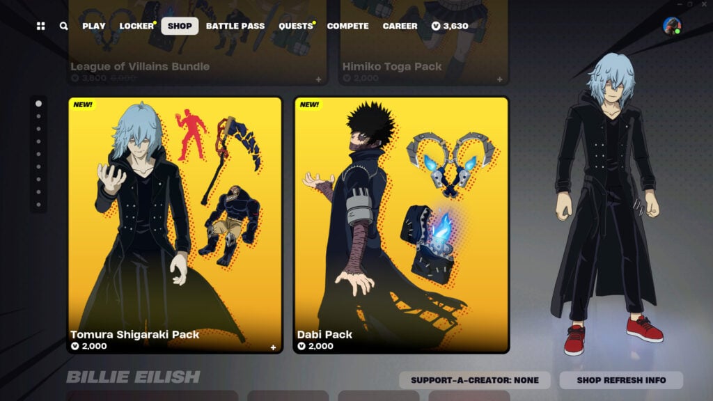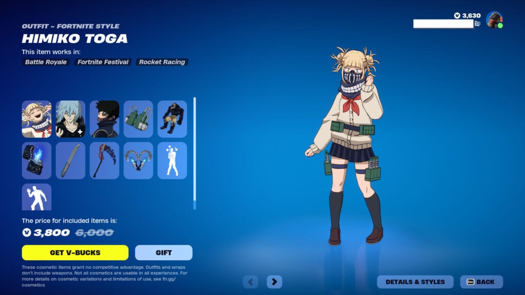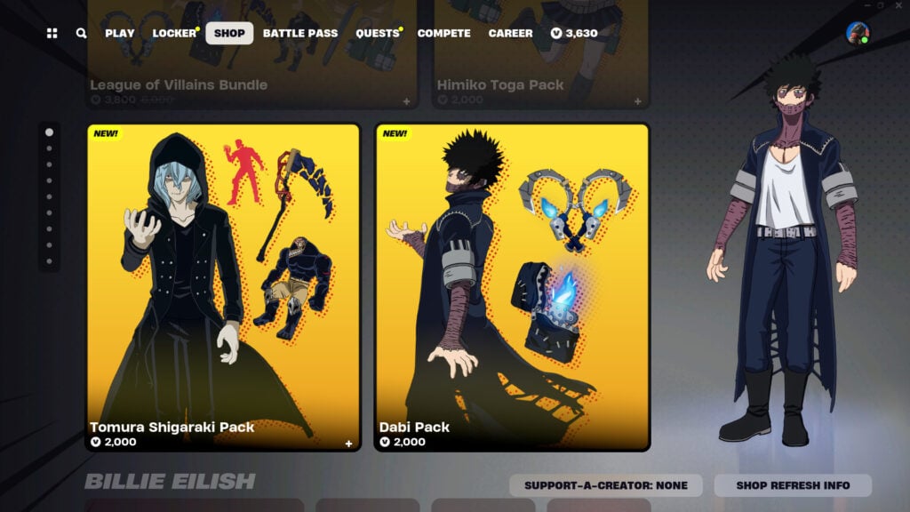 Unlike previous collaborations, these My Hero Academia Fortnite skins are only available in bundles, meaning you cannot purchase the cosmetics separately. Instead, you can buy the individual character packs, each costing 2,000 V-Bucks, or the League of Villains Bundle, which costs 3,800 V-Bucks.