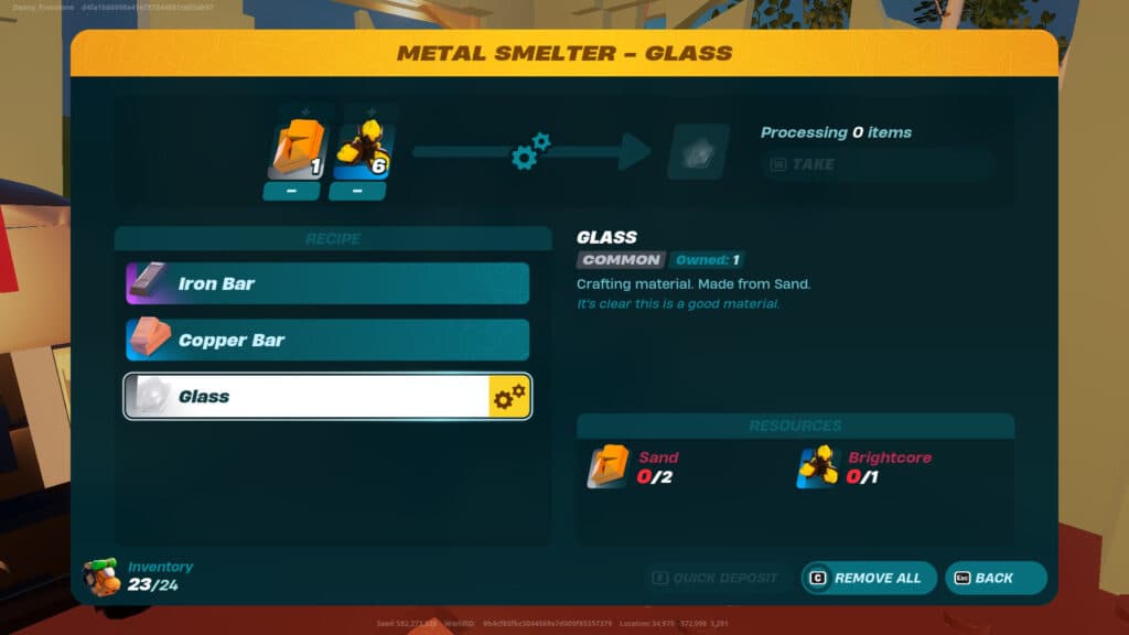- The recipe for creating one glass pane is 2 Sand and 1 Brightcore.