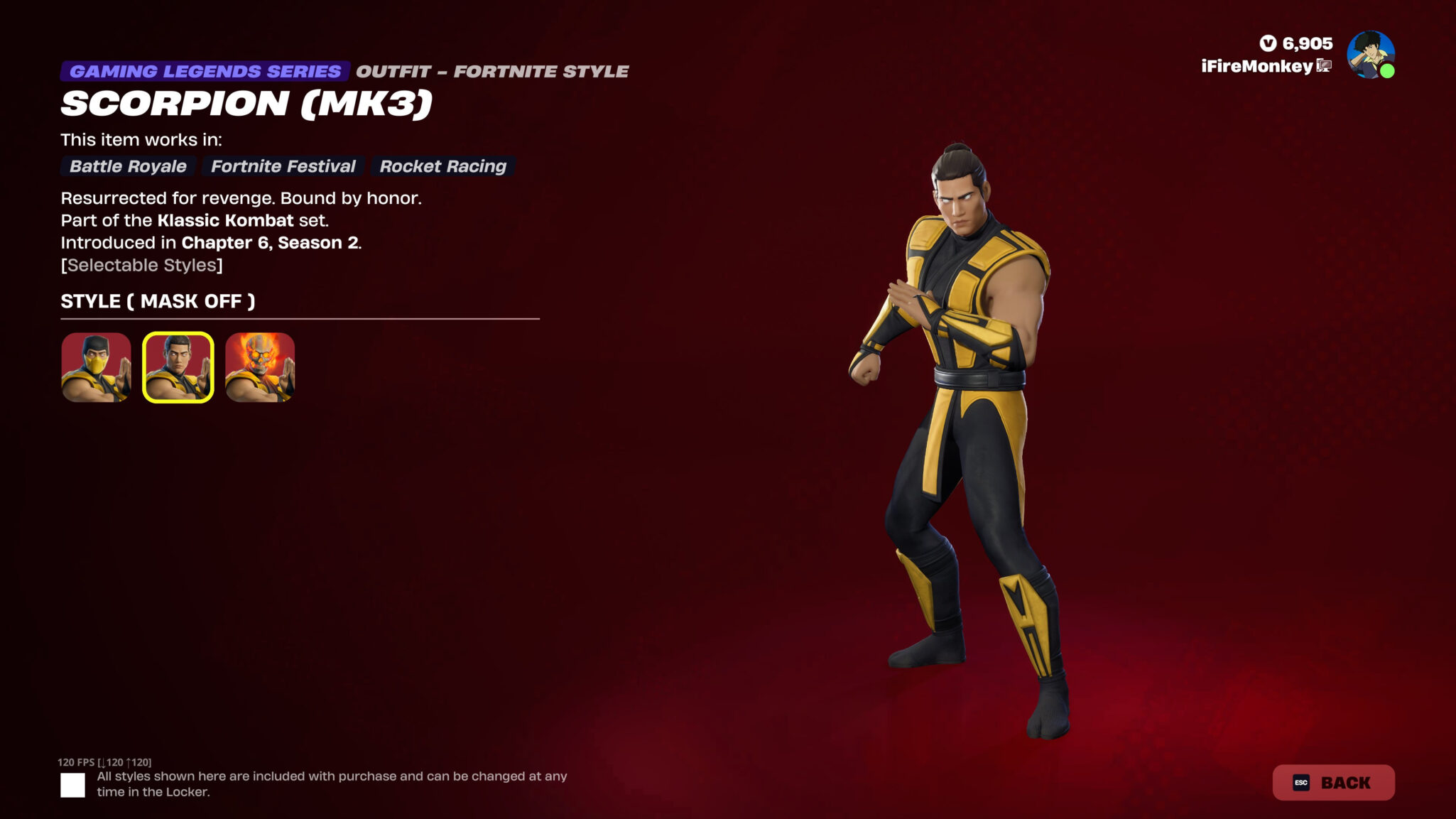 Those styles include his classic Ultimate Mortal Kombat 3 look, the flaming skull look famously seen in his “Toasty” Fatality, and an unmasked version. In addition to the Scorpion skins, you can purchase a Back Bling, Pickaxe, and Emote themed to the Hellspawn.