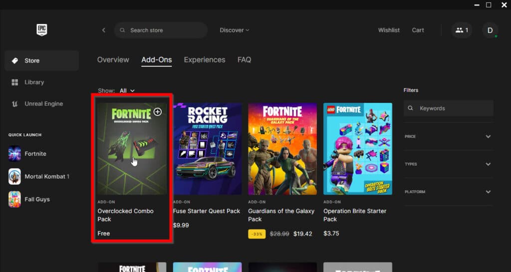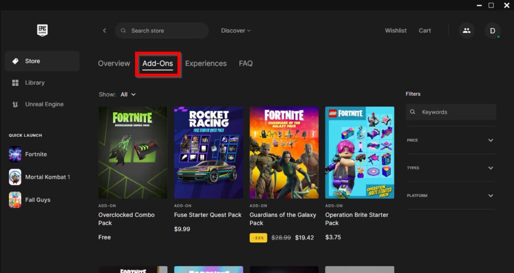 - Select the Fortnite 'Add Ons' option right beside 'Overview.'