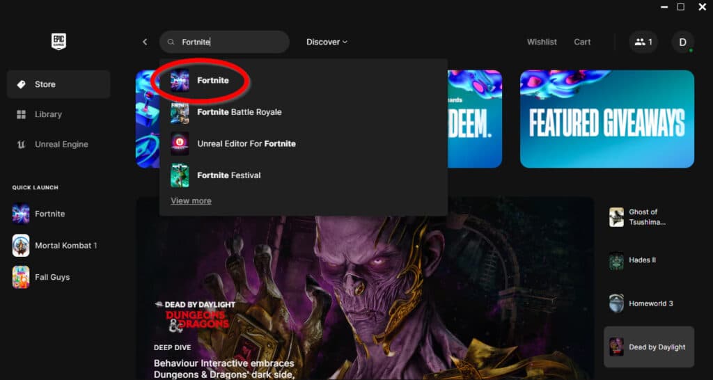 - Search 'Fortnite' and click on the top option.