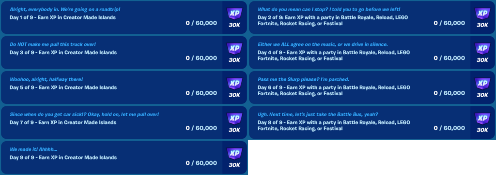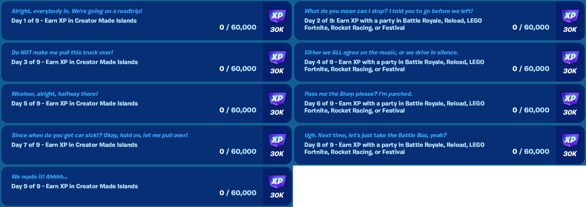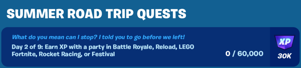 - Earning a certain amount of XP with your party in Fortnite Battle Royale (includes normal BR, Zero Build, Team Rumble, and Reload), LEGO Fortnite, Rocket Racing, or Fortnite Festival.