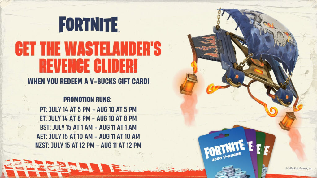 Many leakers in the Fortnite scene have revealed how to unlock the Wastelander’s Revenge Glider. The only requirement is to redeem a V-Bucks gift card, which you can find at all major retailers. However, the promotion does not begin until July 14 or 15, which we will elaborate on shortly.