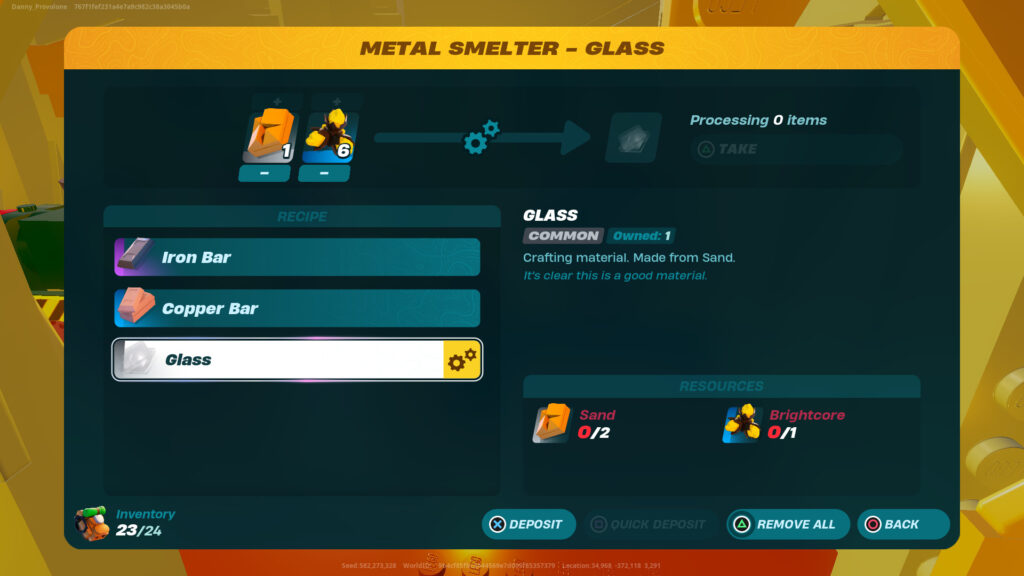 After collecting the Sand and Brightcore, combine them using a Metal Smelter, a device you can create from your “Utility” menu. Glass is the third option beneath Iron Bar and Copper Bar. You will also need 15 Brightcore, 35 Obsidian Slab, and 3 Blast Core to create a Metal Smelter.