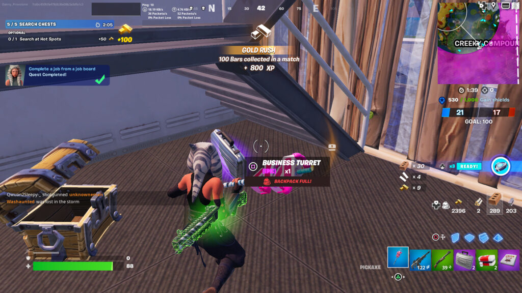 In Team Rumble, we jumped from the Battle Bus and quickly found a chest nearby. After opening it, we completed this Quest and unlocked the Fulcrum Ascending Loading Screen.