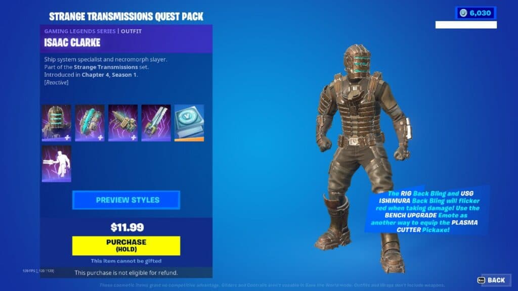 The Dead Space protagonist is available via the Fortnite item shop. This purchase requires you to use real money instead of parting ways with your V-Bucks.