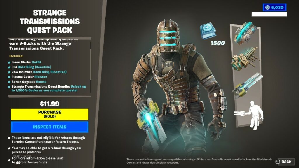 You can unlock the Isaac Clarke outfit, two Back Blings, one Pickaxe, and an emote for $12.99 USD. Furthermore, the bundle features the “Strange Transmissions” Quest Bundle, which allows you to acquire up to 1,500 V-Bucks as you complete quests. It’s worth noting also that you cannot purchase these items individually.
