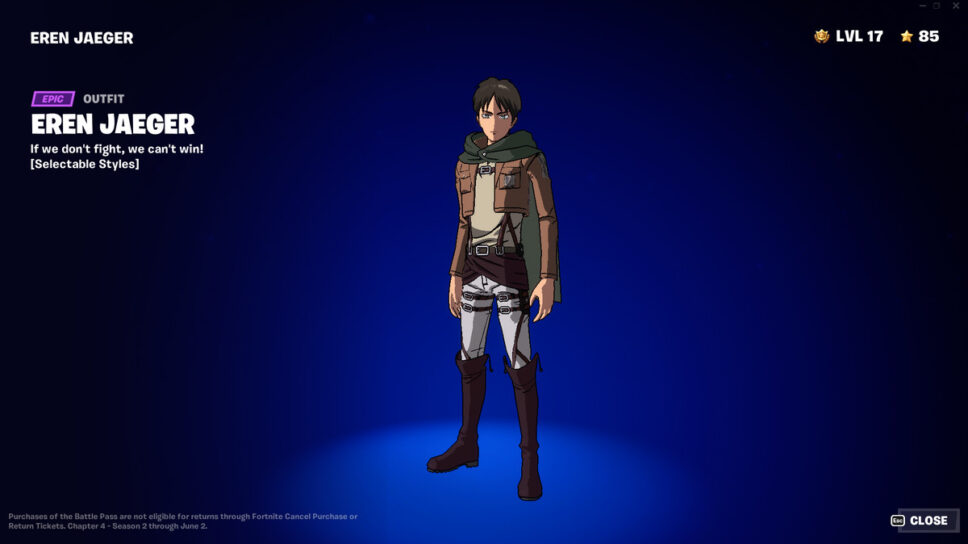Eren Jaeger, née Yeager, has officially entered the world of Fortnite. The latest game update, v24.20, paved the way for the collaboration of Fortnite x Attack on Titan. However, you cannot unlock Eren Jaeger by purchasing the Outfit. Instead, there are eight Quests you must complete.