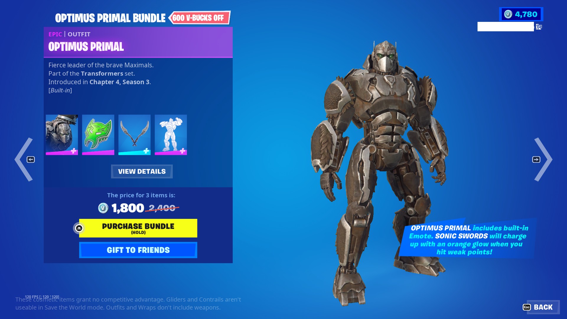 - Optimus Primal Bundle – 1,800 V-Bucks