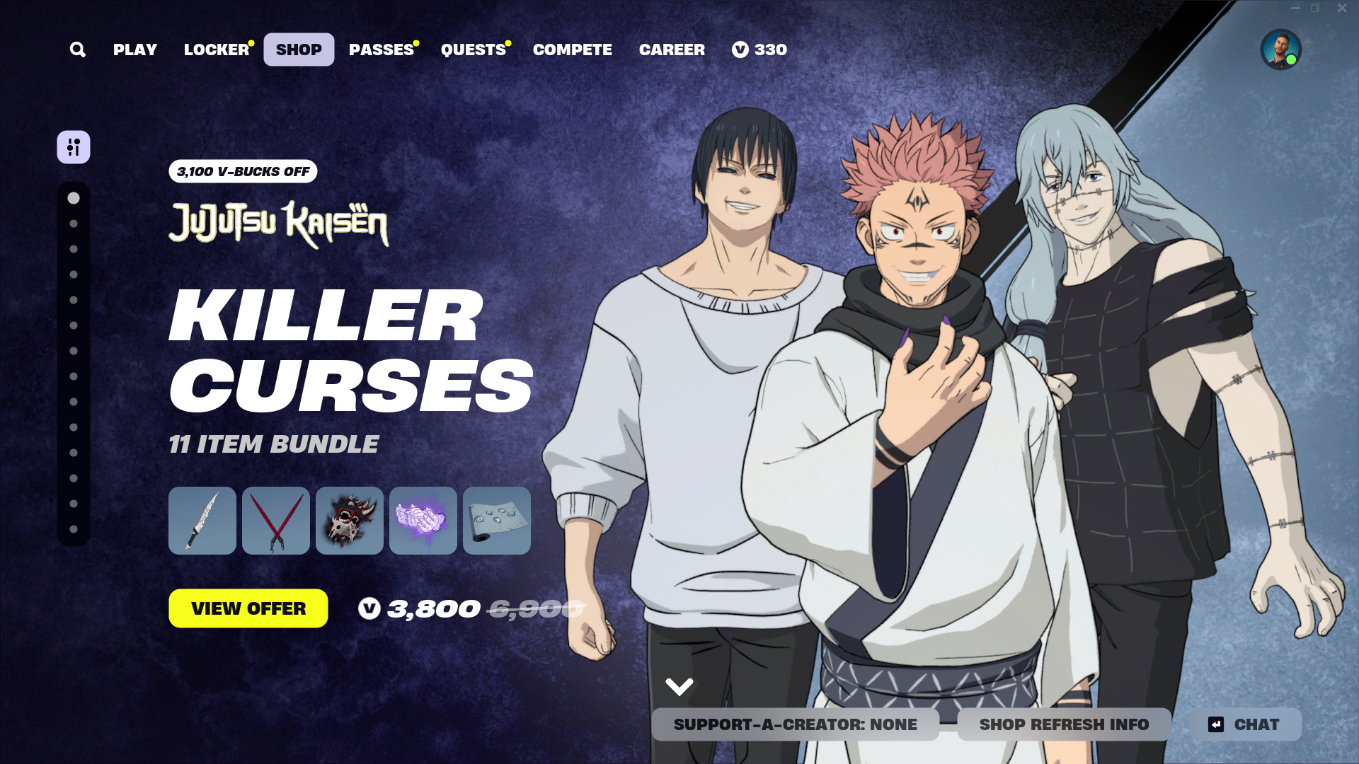 The most valuable option, especially if you’re a JJK fan, is in the “Killer Curses Bundle,” which you can find in the Item Shop for 3,800 V-Bucks. It includes all three wave 2 JJK Fortnite skins, two Back Blings, two Pickaxes, two Emotes, and the Wrap. The Item Shop says the value of these items is 6,000 V-Bucks.