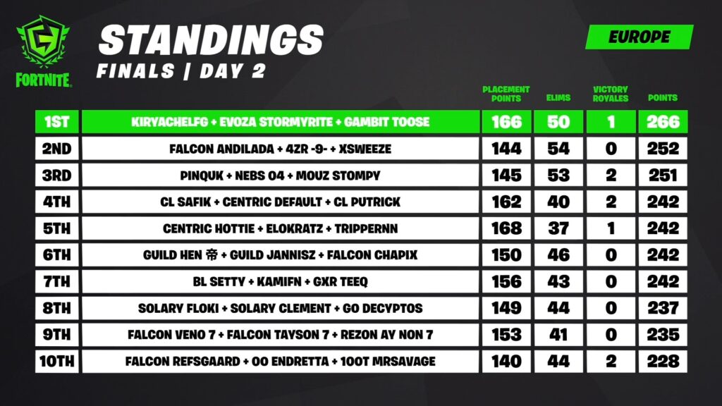 The final weekend of EU FNCS was a roller coaster. Through all the chaos, Kiryache, Stormyrite and Toose came out on top. On the first day of the Grand Finals, three players received wrongful bans. Then two games were voided. This caused eight out of twelve matches to be played on Day 2. Several trios used the long Day 2 to secure a top spot on the leaderboard.
