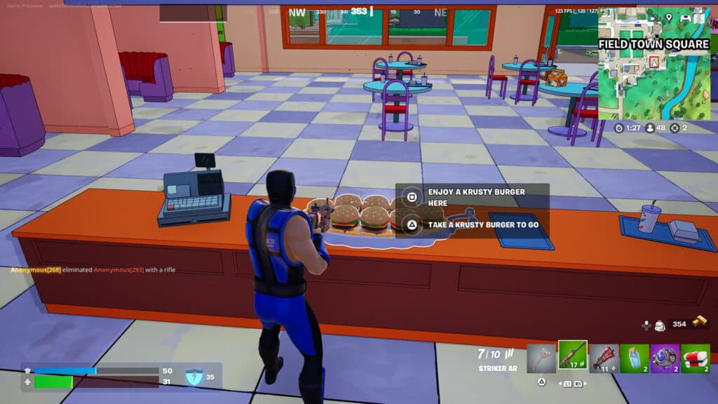 Perhaps the most critical aspect of the Krusty Burger spot in Fortnite is the giant tray of Burgers that can be found on the counter. This is arguably the best item added in Fortnite Chapter 6 Mini Season 2. It's a consumable that heals 10 health and 30 Shield over time.