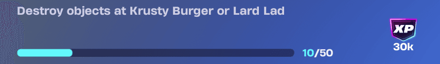 One of the many Quests available this season tasks you with destroying objects at Krusty Burger. You can complete this with ease by visiting the location and pickaxing or shooting anything you see. Once you have destroyed 50 objects, you will receive 30K XP toward your Pass progression.