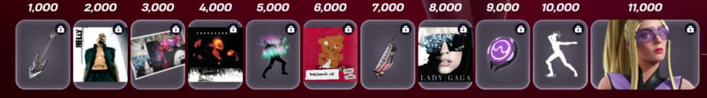As you play Fortnite Festival, players will earn "Festival Points." After earning enough, you can begin unlocking the rewards in the image above. You must earn 11,000 Festival Points and purchase the Premium Fortnite Festival Season 2 Pass to acquire the Enigmatic Gaga skin.