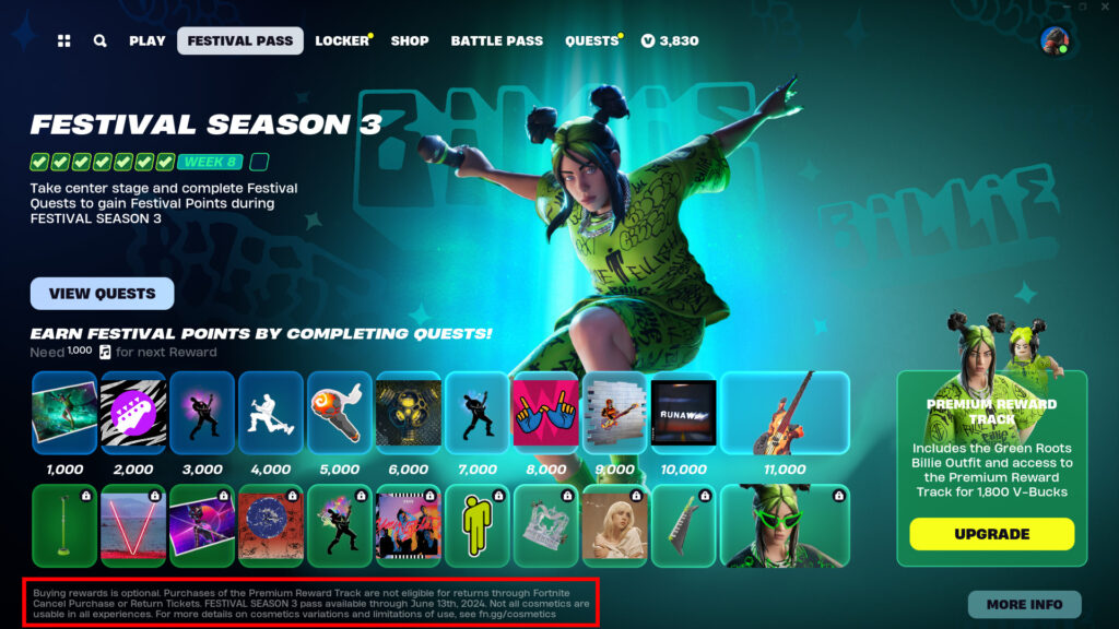Based on the current Fortnite Festival Season 3 Pass, the rumored event would likely occur sometime on or after June 13. As you can see in the screenshot above, the Billie Eilish Festival Pass ends on that day, so an in-game Metallica concert could bridge the gap to Fortnite Festival Season 4.