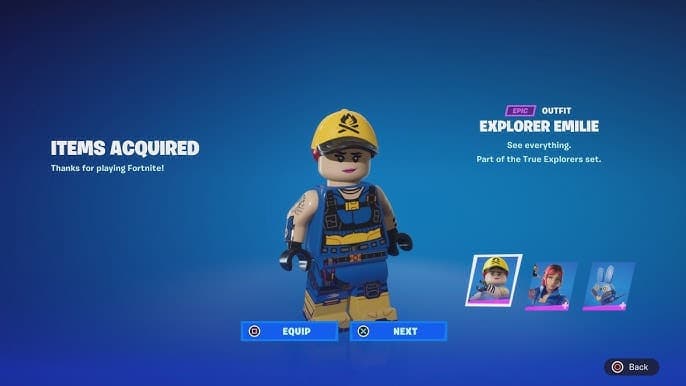 After that, all you have to do is load up Fortnite and you will have your brand-new Explorer Emilie Style skin. And guess what? The skin is also usable in regular Battle Royale and Zero Build mode; not just LEGO Fortnite!