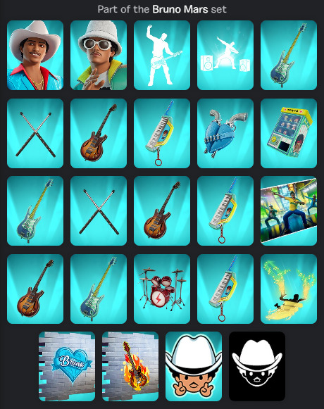 The image above gives you an idea of the cosmetics you can expect on Nov. 29, based on the Bruno Mars collaboration, including Instruments, Loading Screens, and more. More details will come to light regarding Fortnite Festival x Lisa over the next few days in the lead-up to the end of Chapter 6.