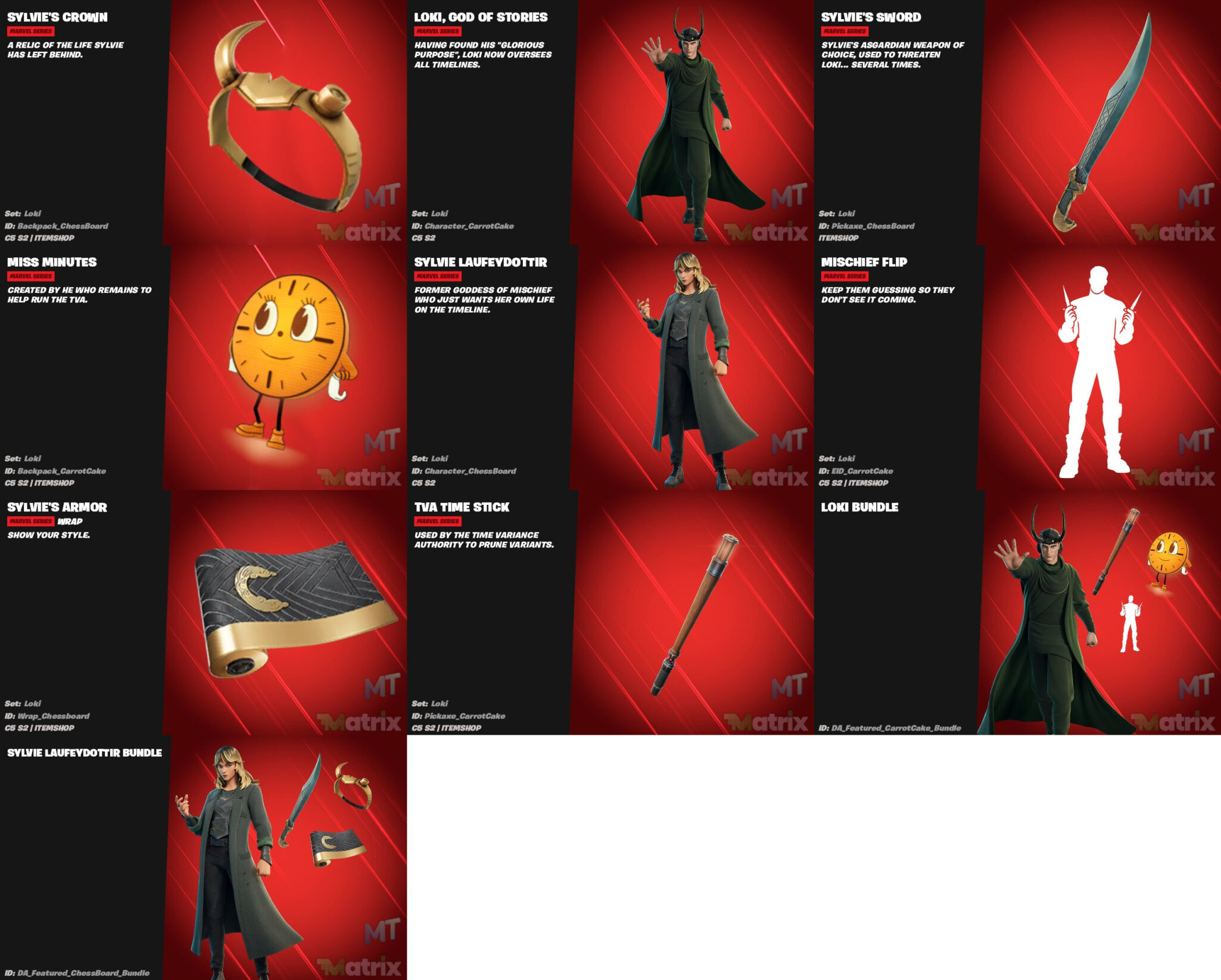 Fortnite leaker and data miner GMatrix published a complete list of the Loki cosmetics coming to Fortnite. As you can see, the collaboration includes two Outfits, two Pickaxes, an Emote, and a Wrap. Additionally, players will have the opportunity to purchase a Sylvie Laufeydottir and/or Loki Bundle.