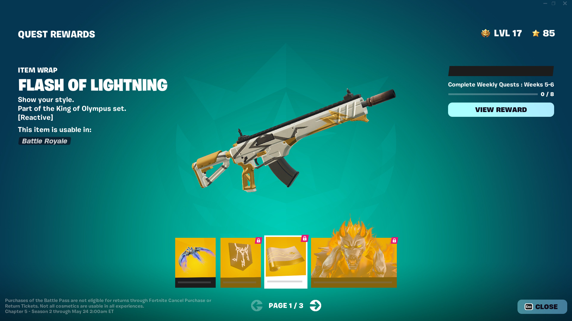 - Reward #3 – Flash of Lightning Wrap (Complete 8 Quests in Weeks 5/6)